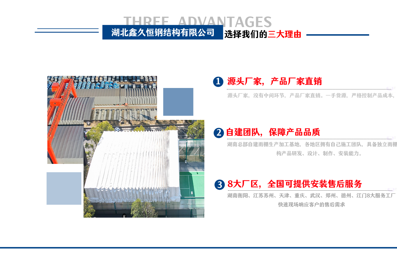 湖北鑫久恒鋼結(jié)構(gòu)有限公司是一家電動雨棚、膜結(jié)構(gòu)車棚研發(fā),生產(chǎn)銷售,施工安裝于一體的專業(yè)鋼結(jié)構(gòu)科技公司,主要產(chǎn)品有伸縮雨棚,電動雨棚,膜結(jié)構(gòu)車棚等。 湖南地區(qū)職員目前有80多人,占地面積20000平方米,廠房面積15600平方米,配備先進的生產(chǎn)流水線,使每件品質(zhì)產(chǎn)品的堅實基礎(chǔ)。 公司在蘇州、天津、重慶、武漢、德州、烏魯木齊、江門均設(shè)有服務(wù)工廠,總?cè)藛T共300多人,擁有專業(yè)的技術(shù)團隊,配備先進的設(shè)備和流水線生產(chǎn),產(chǎn)能高,貨源充足,發(fā)貨速度快,服務(wù)區(qū)域廣。 移動伸縮棚適用于通道臨時倉儲、戶外運動遮陽、污水池遮蓋、能源交通、熱力化工、礦山、船舶制造及市政建設(shè)、物流、碼頭等領(lǐng)域的構(gòu)件制作加工,成品半成品存放、倉庫、野外儀器設(shè)備操作用房等。尤其是對工廠發(fā)貨、倉儲臨時遮雨防嗮,梅雨期較長、建設(shè)周期較短的工程施工等特別適用。還可根據(jù)用戶需求量身定制、適合企業(yè)所需不同款式的產(chǎn)品。 我公司堅持“誠信社會為本,客戶滿意為榮”的經(jīng)營理念,做到質(zhì)量把控,嚴格管理,精益求精,恪守承諾。使鑫久恒逐步走向成熟,其系統(tǒng)化、專業(yè)化日趨完善。以專業(yè)的技術(shù)、科學(xué)的管理,更高的產(chǎn)品質(zhì)量,優(yōu)良的企業(yè)信譽,真誠的客戶服務(wù),靈活多樣的經(jīng)營方式和務(wù)實創(chuàng)新的企業(yè)精神愿與社會各界攜手合作,為推動智能鋼結(jié)構(gòu)建筑事業(yè)的發(fā)展而不斷努力。...